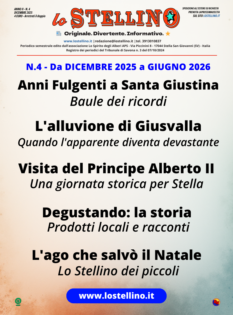 Assapora, esplora, emozionati Il portale che accende il cuore del territorio! Il paradiso di terra e mare Scopri le tradizioni più autentiche, lasciati conquistare dai sapori locali, partecipa a eventi imperdibili e vivi esperienze che ti resteranno dentro. Prossimi eventi Senza perdere la gioia - Spettacolo 30 GENNAIO 2026 ORE 21:00 Presso la sala polifunzionale "San Giovanni" - Via Muzio 43, Stella (SV). Premi l'immagine per vedere i punti di ritiro. Lo Stellino N. 4 - Ultima uscita DISPONIBILE NEI PUNTI DI RITIRO Quarta uscita del periodico "Lo Stellino". Premi l'immagine per vedere i punti di ritiro. Presentazione del portale e del progetto APRILE 2026 Da confermare Le associazioni Le associazioni che promuovono e rendono vivo il nostro territorio Vedi le Associazioni locali Dove dormire Le strutture ricettive del nostro territorio Scopri le strutture Dove acquistare Scopri l’offerta commerciale della zona Vedi i negozi e le attività Dove mangiare Bar, tavole calde e ristoranti della zona Scopri le strutture Le eccellenze Scopri le eccellenze del territorio: tradizioni, artigiani e talenti che rendono unica la nostra terra Vedi le eccellenze Servizi Dal tempo libero alle esigenze quotidiane Scopri i servizi Contattaci Abilita JavaScript nel browser per completare questo modulo. Abilita JavaScript nel browser per completare questo modulo. tuo qui e Nome e cognome * Nome Cognome Email * Scrivi qui il tuo messaggio Invia Collaborano con noi: